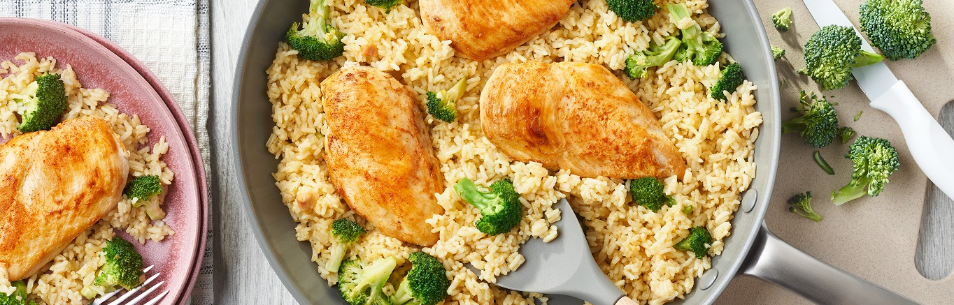 Aquí está, ¡la receta perfecta para una comida en un día ajetreado!  La receta de pollo y arroz en 15 minutos te ofrece pollo, arroz y vegetales, todo en una sartén, todo en 15 minutos, de principio a fin.  También utiliza ingredientes que generalmente tienes a mano, ¡así que no hay necesidad de salir a comprar en último minuto!  Comienza por dorar unas pechugas de pollo y luego agrega crema condensada de sopa de pollo, agua, arroz instantáneo y brócoli a la sartén.  ¡Solo asegúrate de usar arroz instantáneo para que se cocine rápidamente!  Incluso puedes usar arroz integral instantáneo.  Esta receta de pollo y arroz en 15 minutos es tan rápida y fácil que nadie tendrá tiempo para preguntar: ¿qué hay para la comer?