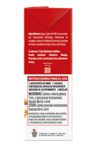 Ingredientes Agua, Caldo de Pollo Concentrado, Sal, Saborizantes Artificiales, Hidrolizado de Levadura, Azúcares Añadidos (Dextrosa), Inosinato de Sodio, Guanilato de Sodio, Cloruro de Potasio.
