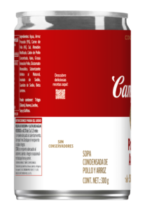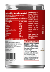 Ingredientes Agua, Arroz Precocido (9%), Carne de Pollo (4%), Sal, Almidón Modificado, Caldo de Pollo Concentrado, Apio, Grasa Animal de Pollo, Glutamato Monosódico, Saborizante Idéntico al Natural, Inosinato de Sodio, Guanilato de Sodio, Beta caroteno.