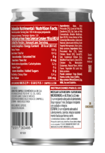 Ingredientes Agua, Arroz Precocido (7%), Carne de Pollo (4%), Zanahoria (2%), Sal, Caldo de Pollo Concentrado, Almidón Modificado, Apio (0,5%), Grasa Animal de Pollo, Glutamato Monosódico, Saborizante Natural, Saborizante Artificial, Aceite Vegetal, Ácido Láctico, Beta caroteno. v