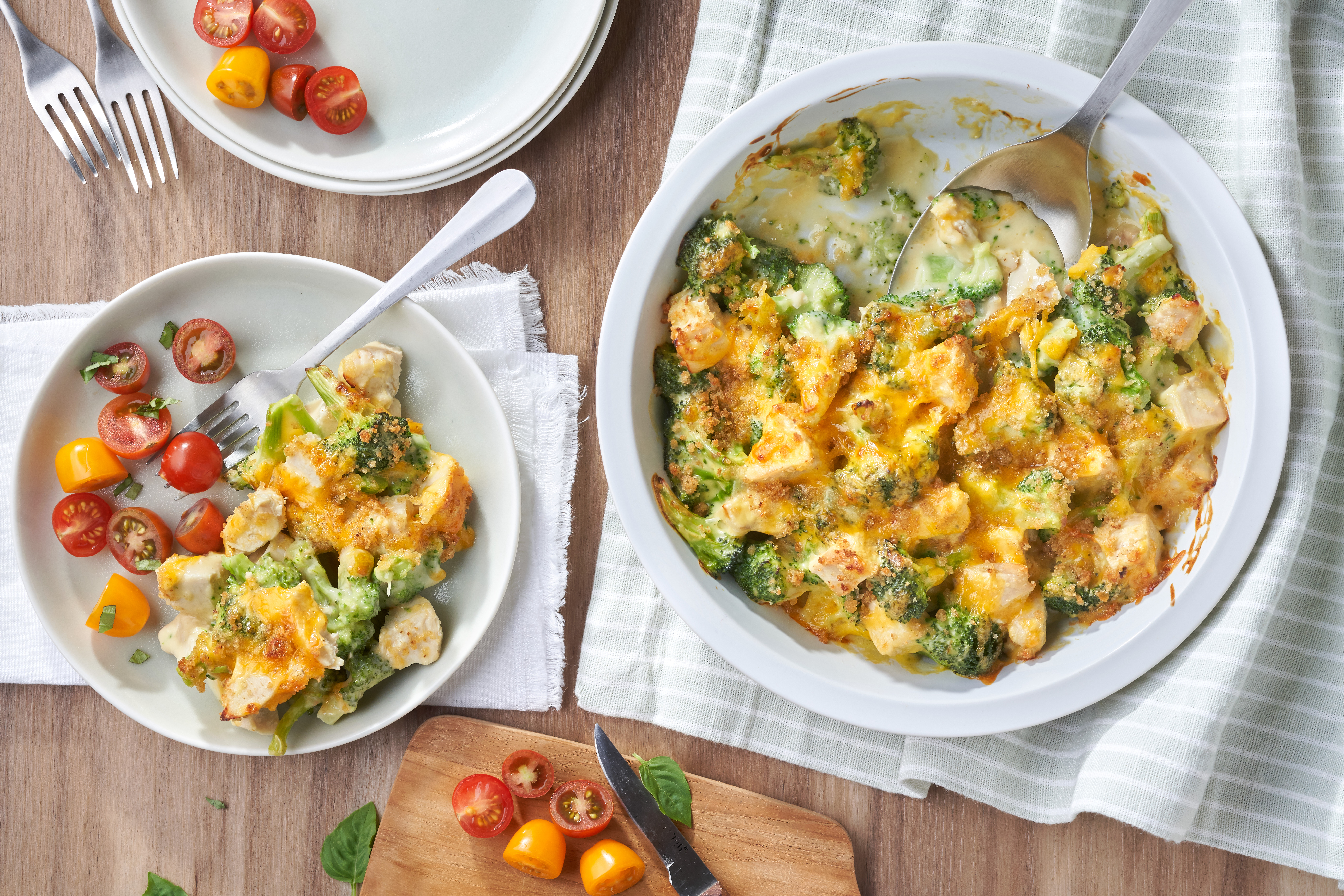 Calienta el horno a 200 °C (400°F). Mientras el horno se calienta, coloca el brócoli y el pollo en un molde para tarta de 23 cm
