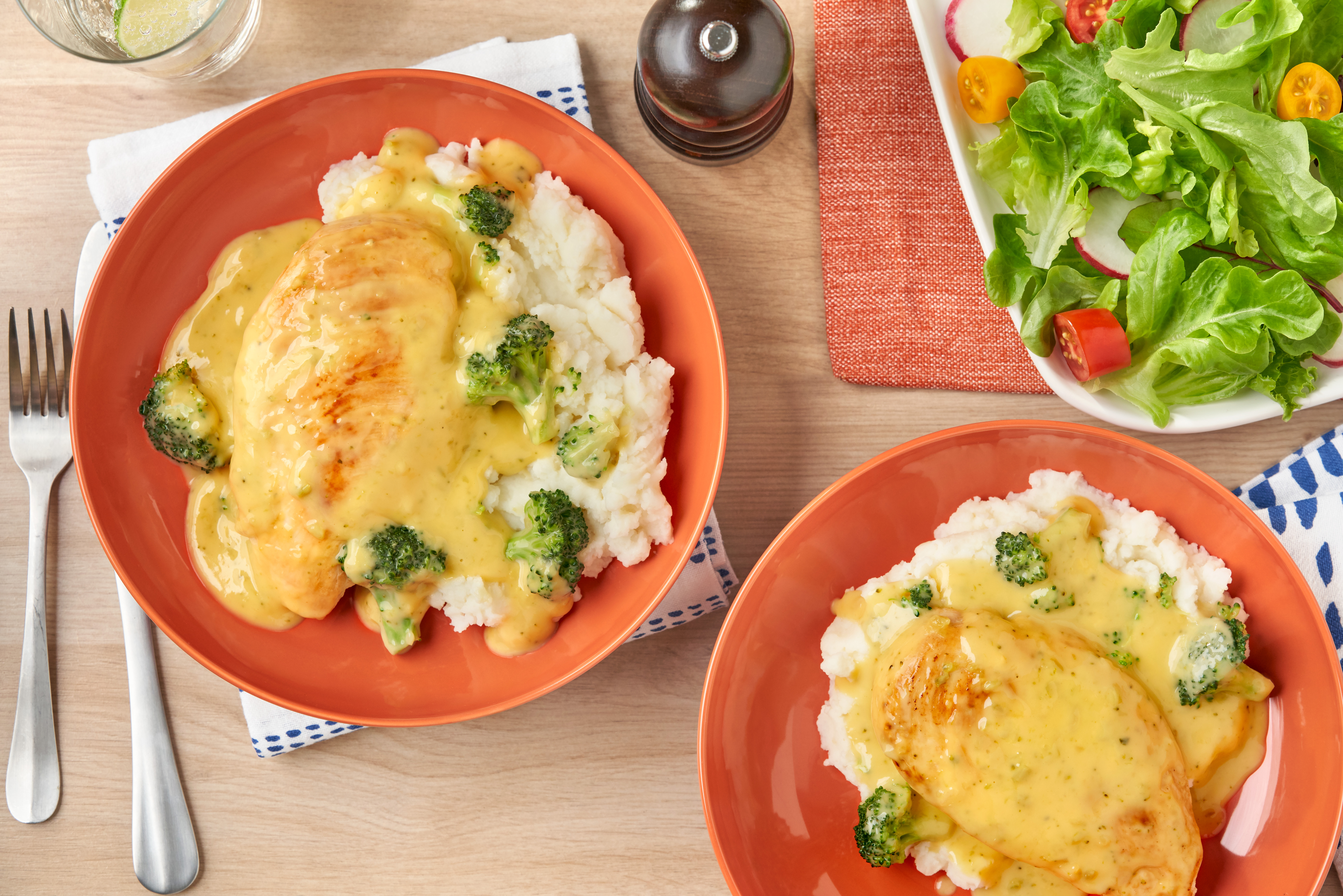Este pollo con Sopa crema condensada Campbell’s de champiñón, queso cheddar y puré de papas es un tazón de confort que puedes preparar en 30 minutos (bueno, puedes servirlo en platos, ¡pero nos gusta acurrucarnos con tazones de esto después de un largo día!). El pollo y el puré de papa se bañan en una salsa rica y cremosa. Nos encanta agregar brócoli para darle ese toque equlibrado de sabor.