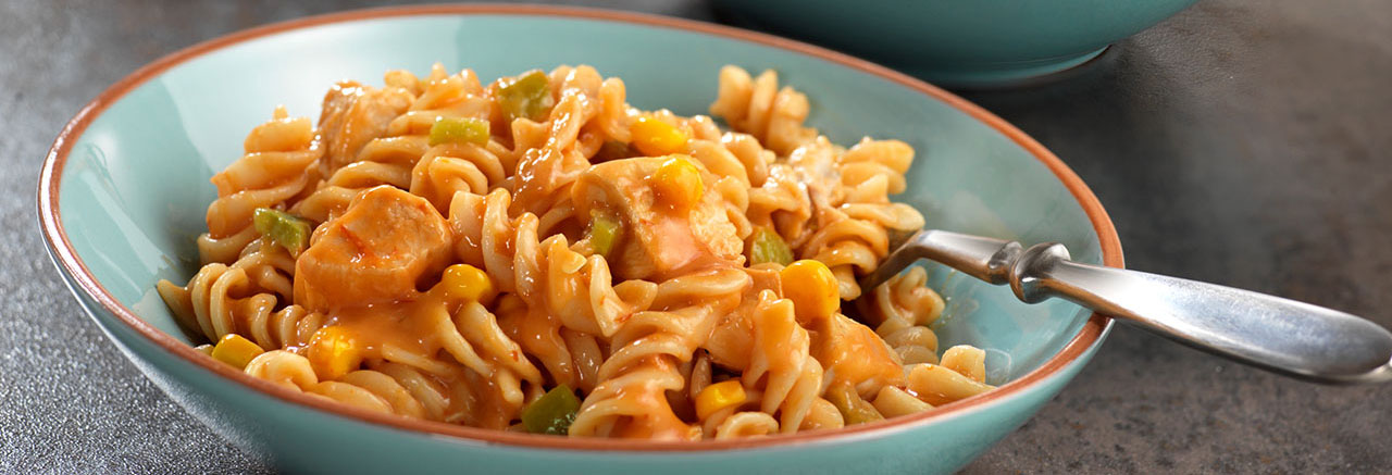 Sauteed chicken. rotini and corn are coated in a flavorful sauce made from Cheddar cheese soup and picante sauce.