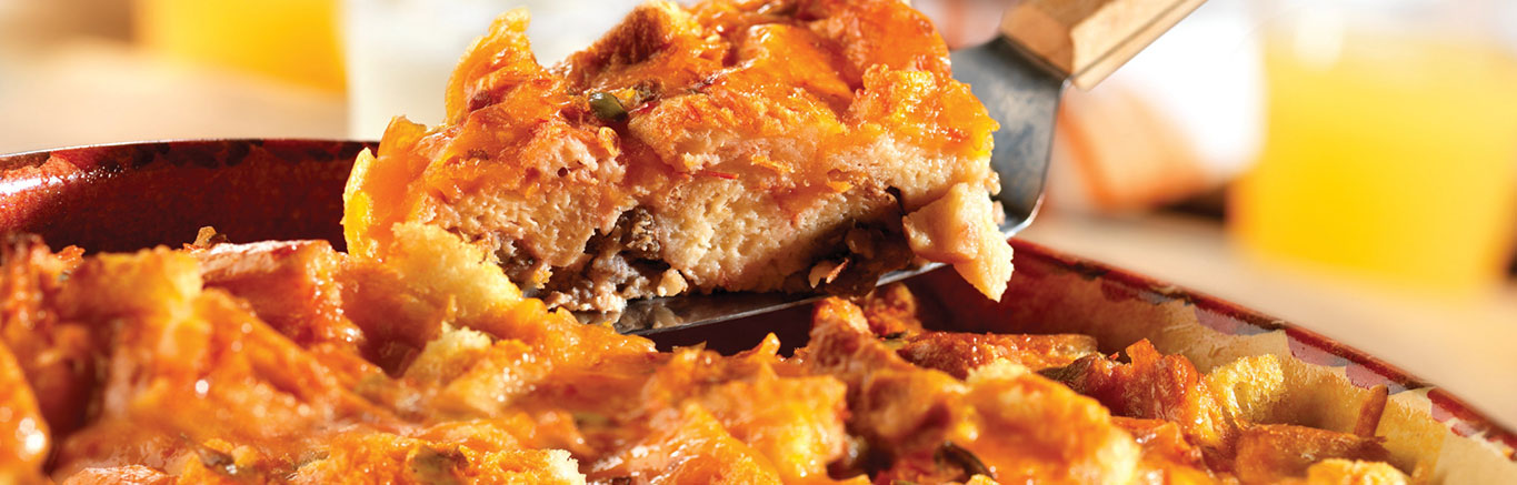 Spoon the sausage into an 11 x 7 x 2-inch baking dish. Top with the bread cubes and cheese. Beat the picante sauce, eggs and milk in a medium bowl with a fork or whisk. Pour the picante sauce mixture over the bread mixture. Stir and press the bread mixture into the picante sauce mixture to coat. Cover and refrigerate for 2 hours or overnight.