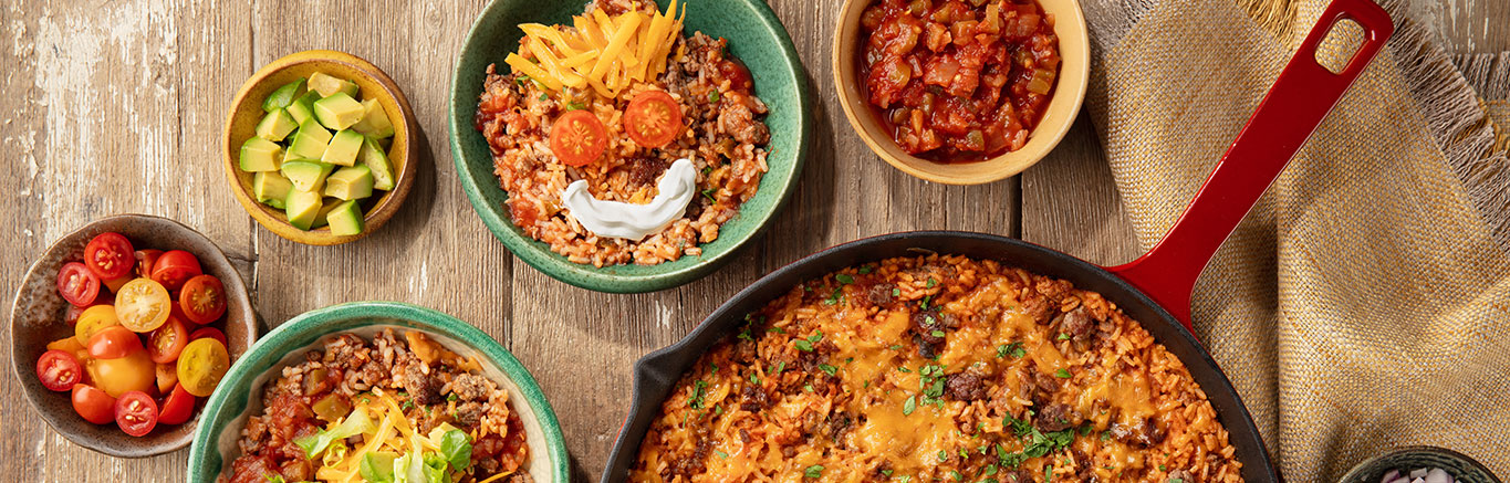 This fresh take on burritos transforms a Mexican favorite into a bowl. Everything cooks in one pan in under 30 minutes, so cleanup is a breeze. In this recipe, cumin-seasoned ground beef simmers with picante sauce and uncooked rice and then gets topped with cheese. The best part? Everyone can customize their bowls with their favorite burrito fixings.