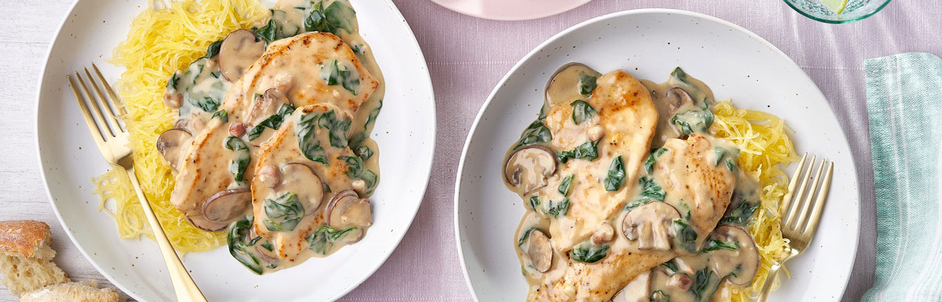 This Creamy Garlic Parmesan Chicken has it all- with bacon, a creamy sauce, and even a serving of vegetables, you’ll definitely be glad this one-skillet recipe for Big Batch Creamy Garlic Parmesan Chicken makes enough for multiple meals. You can serve the tender white meat chicken breast in a garlic-Parmesan cream sauce with mushrooms and spinach over the carbs of your choice, then save the leftovers to stuff into Spinach Lasagna Roll-Ups the next day. Even better, the recipe for Big Batch Creamy Garlic Parmesan Chicken doesn’t make a big mess, since it all cooks in a single skillet. You get two meals’ worth of food and minimal dishes to wash- that’s how to make dinner great.