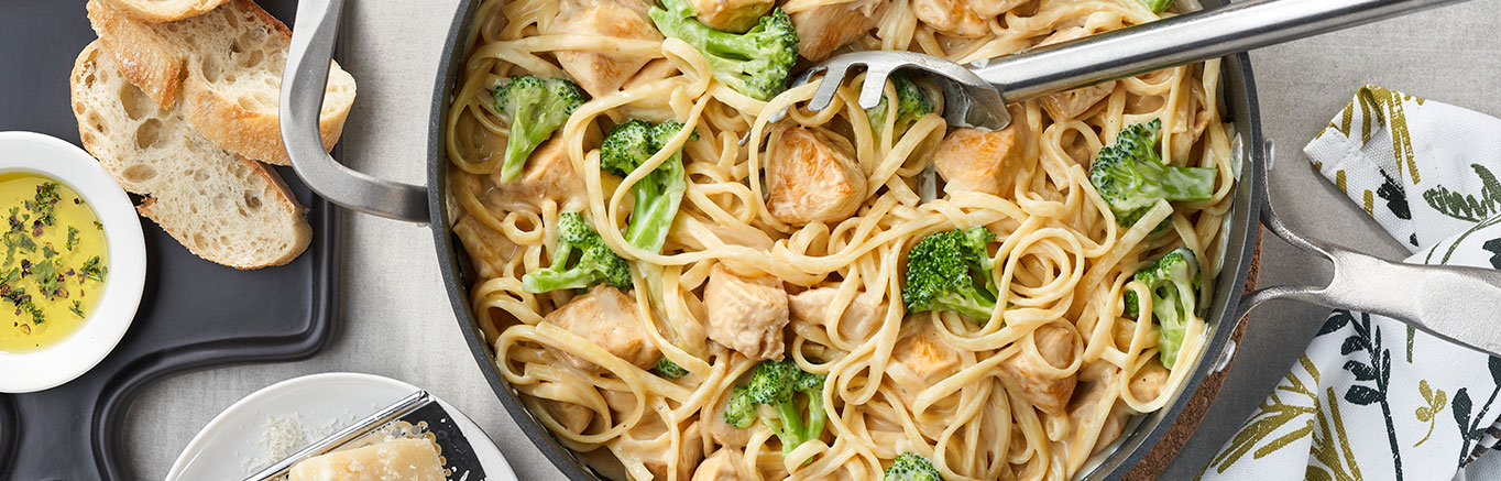 You might think traditional Italian cooking with sauce made from scratch has to be time consuming, but not this Chicken & Broccoli Alfredo. The entire recipe, including the classic creamy cheese sauce, comes together in just a half hour. Bites of white meat chicken, tender broccoli florets, and delicate strands of linguine are coated in a rich cheese sauce with mushroom bits for extra savory flavor. If you can boil water, you can cook this homemade Chicken & Broccoli Alfredo recipe for a fast weeknight meal everyone will enjoy.