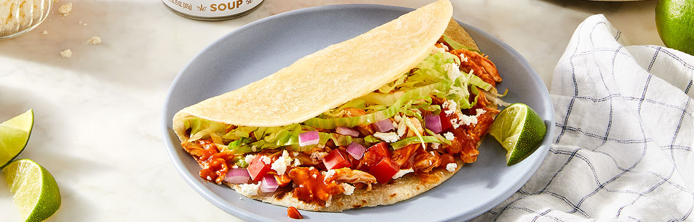 Serve the chicken filling in the tortillas with the queso fresco, if desired. Top with the lettuce and red onion and serve the lime wedges on the side.