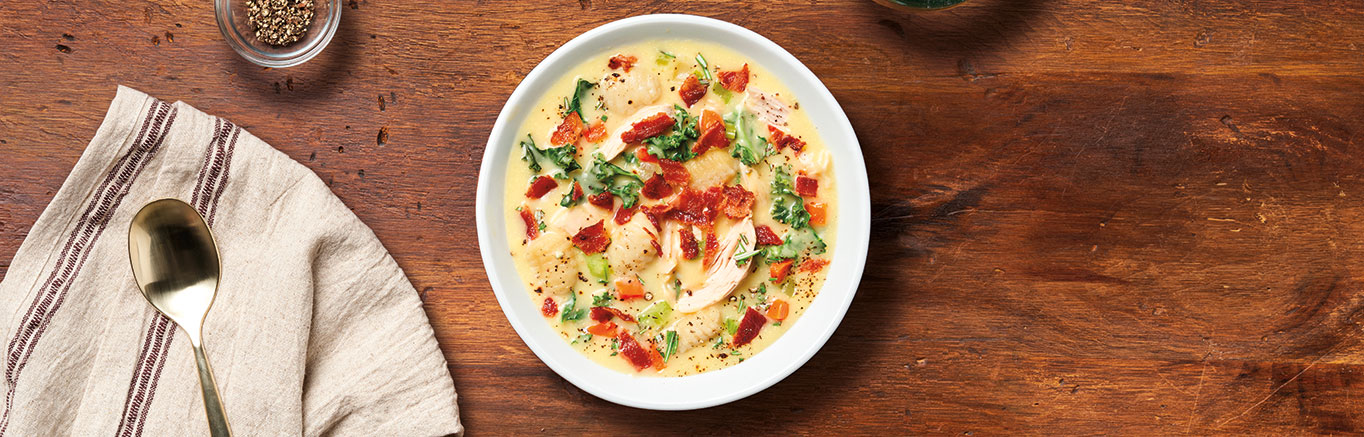 Looking for a new way to enjoy leftover turkey? This Creamy Gnocchi Soup isn’t just a brilliant way to make sure extra food doesn’t go to waste, it’s a dish you’ll make again and again because everyone will love it! If you've never thought to use potato gnocchi in soup before- this recipe is the perfect place to start. The soft but hearty texture of the potato gnocchi simmers in a creamy, savory broth, made with smoky bacon, sauteed veggies and cream of chicken soup. Add some leftover cooked turkey or chicken and chopped kale (spinach will work, too!) and you'll have a main dish soup that's not only comforting and delicious but really simple to make. Just a few on-hand ingredients pulled from the fridge and pantry and Creamy Gnocchi Soup with Turkey is ready in 50 minutes!