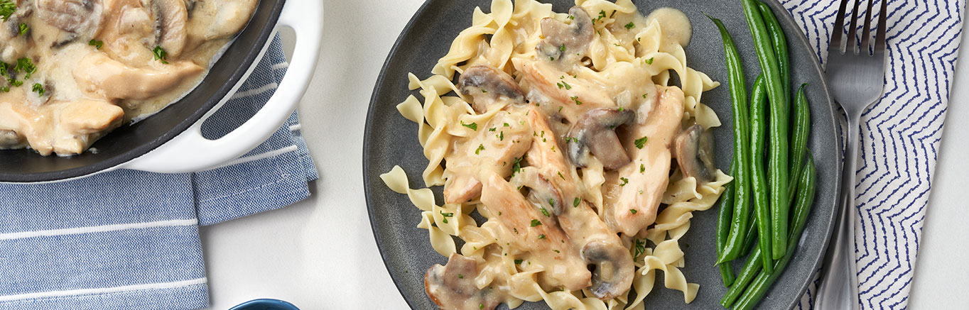 Need another way to make chicken? This Easy Chicken Stroganoff recipe takes a legendary comfort food dish and combines it with your favorite on-hand ingredient- chicken breasts! This version uses condensed cream of chicken soup, but cream of mushroom works great, too. The soup turns into a creamy sauce for simmering the chicken, mushrooms and onion. Easy Chicken Stroganoff is traditionally served over hot cooked egg noodles, but it's also delicious over rice or if you're feeling really decadent, mashed potatoes!