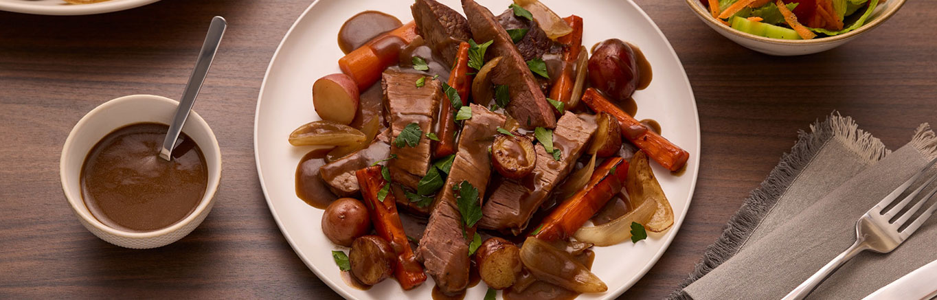 Nothing says homemade comfort food quite Pot Roast. This Easy Pot Roast recipe is great because it takes all the guesswork out of the most important part: the gravy. All you need to do is brown the beef, add the veggies and stir in our savory Beef Gravy. Cook until the beef is fall-apart tender and the potatoes, carrots and onions are perfectly done (we simmer with a sprig of fresh rosemary to add an herbal note). Pot roast is still around for a reason—it's a classic easy, hearty, warming dinner!