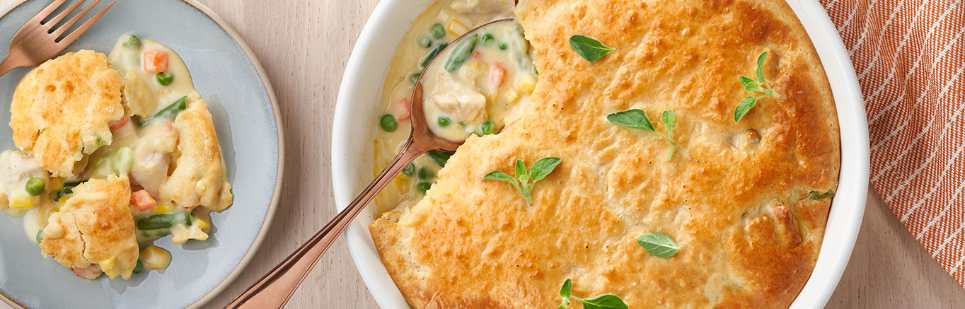 This Easy Turkey Pot Pie recipe is really a template- there are infinite variations, as long as you stick to the formula: 1 can condensed cream soup, 1 cup cooked meat and 2 cups vegetables. Baking transforms the soup into creamy gravy that brings the filling together. A pot pie is always comfort food, especially this one with a fluffy biscuit crust! This recipe is a traditional, homestyle take on a classic. But you can absolutely change this Easy Turkey Pot Pie up to fit your tastes or whatever's in your fridge.