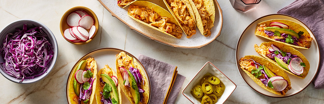 With a can of Campbells® Condensed Spicy Nacho Cheese Soup and some shredded rotisserie chicken, you can have a quick and easy meal to spice up any weeknight. These Fully Loaded Chicken Queso Tacos turn the classic Tex-Mex nachos into a satisfying dish. Make them with just a few garnishes or go all in with a full load of extras to add to the chicken filling and crunchy shells.