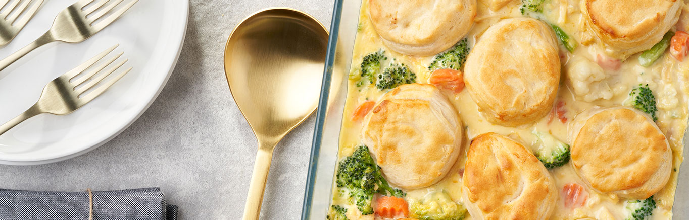 It takes longer to preheat the oven than it does to put together Homestyle Chicken & Biscuits! The condensed cream of chicken soup turns into a creamy gravy that transforms chicken and veggies into a fantastic one-dish meal. There's literally nothing to prep in this recipe- just combine a few on-hand ingredients and top with refrigerated biscuit dough. Homestyle Chicken & Biscuits is like a cross between chicken pot pie and chicken and dumplings, and will be just as popular at your dinner table!