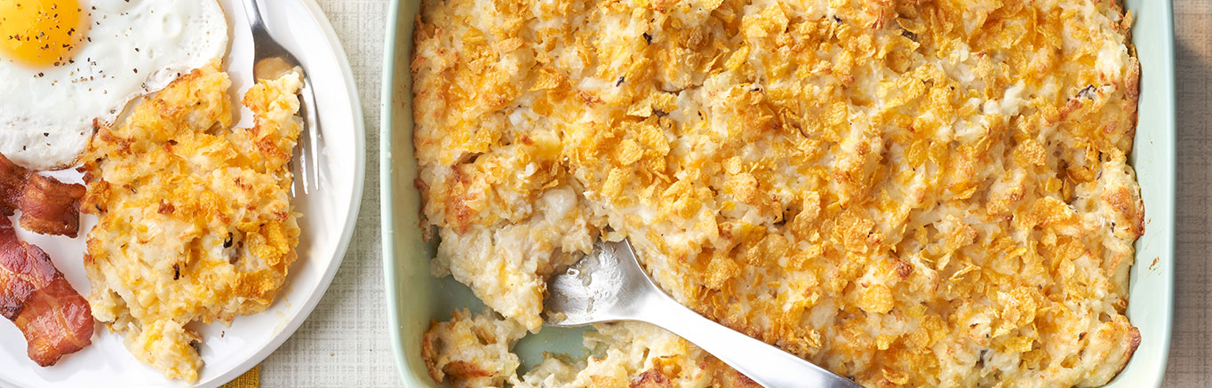 Jill's Hash Brown Casserole is a gift to all the home cooks who have to bring a dish to a potluck or a brunch and need to use what's already on hand.  This recipe has basically no prep- you stir the ingredients in a baking dish, top with crushed cornflakes and bake!  Don't have any cornflakes?  Try a mixture of panko or crushed crackers with a little melted butter!  Whichever topping you choose, people just love this dish.  Condensed cream of mushroom soup bakes with hash browns, onion and cheese to make Jill's Hash Brown Casserole into a comfort food dish that tastes amazing!  Don't wait for a party!  It's so easy, you can make it anytime (breakfast for dinner, anyone?)!