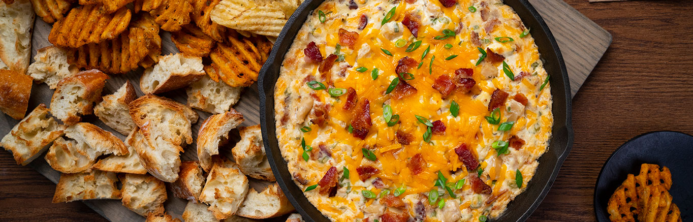 This Loaded Baked Potato Dip recipe is always ready to come off the bench to save the day at game time! Just pull 6 ingredients from the pantry and fridge, stir and bake. This dip really couldn't be any easier to make, and it tastes like a loaded baked potato, thanks to flavor-packed baked potato soup, Cheddar and cream cheeses and of course, bacon and green onion. Everything bakes together into a creamy, cheesy, hearty dip in only 30 minutes. You can serve this Loaded Baked Potato Dip with your favorite dippers, but we really love serving with crispy waffle fries or potato chips for maximum comfort food impact.