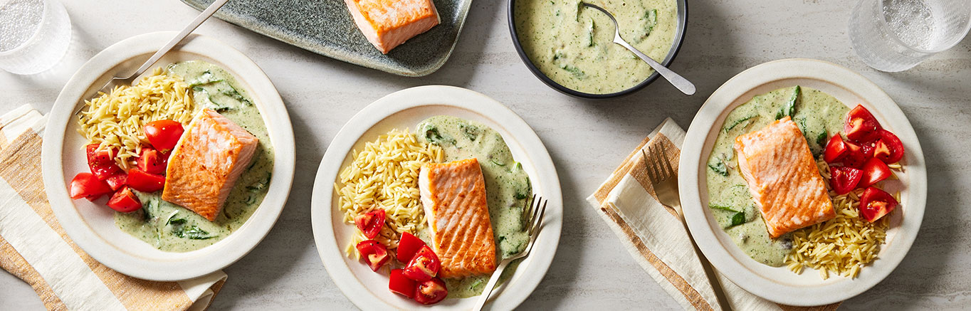 Oven-broiled salmon is instantly elevated with a creamy, herby spinach and pesto sauce that gets its depth of umami flavor from Campbell’s® Condensed Cream of Mushroom Soup. The vibrant tomatoes and basil give it a burst of freshness, while a bed of orzo adds to the Mediterranean flair (plus, it’s a convenient way to soak up every last drop of that delicious sauce).