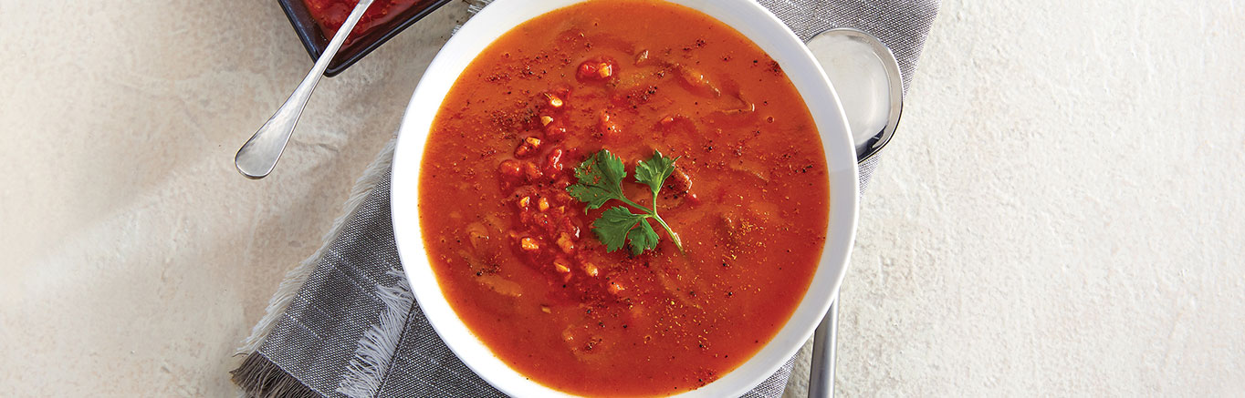 There are so many global cuisines that use tomatoes, like this Moroccan Smoky Tomato & Harissa Soup recipe, inspired by Moroccan recipes and cooking. What is harissa? Harissa is a spicy roasted red pepper paste, popular in Moroccan cooking, here used in its powdered form. The incredibly versatile tomato gets a sophisticated treatment, with smoky notes from paprika and heat from the harissa powder. Together, they add a depth of flavor to this otherwise simple Moroccan Smoky Roasted Tomato & Harissa Soup recipe, making it extra comforting as a starter or side.