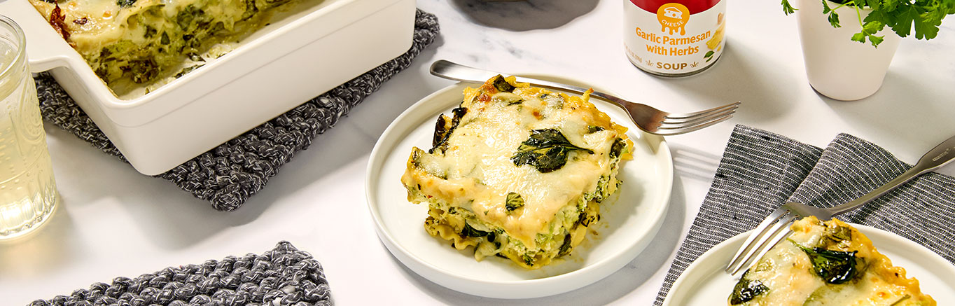 Whip up a quick and easy No-Boil Garlic Parmesan Lasagna for a comforting and flavorful variation on traditional lasagna! This simple, meatless recipe uses oven-ready lasagna noodles and gets its incredible flavor and creamy texture from Campbell's® Condensed Garlic Parmesan with Herbs Soup. Just layer the no-boil noodles with a cheesy ricotta and broccoli mixture and flavorful garlic parmesan sauce then top with mozzarella and bake until bubbly and golden.