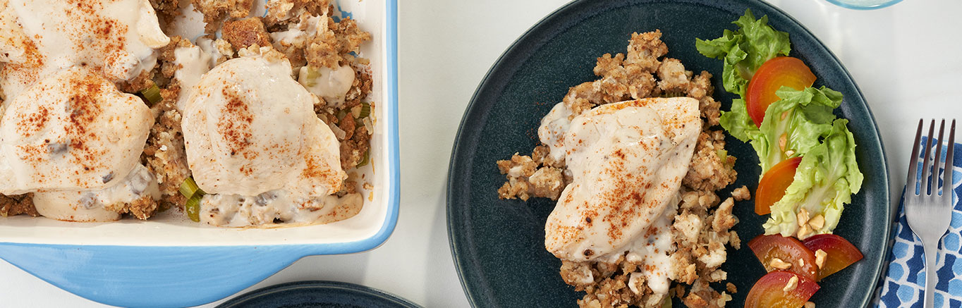 Spoon the stuffing into a 13x9x2-inch baking dish. Season the chicken with salt and pepper. Place the chicken on the stuffing.