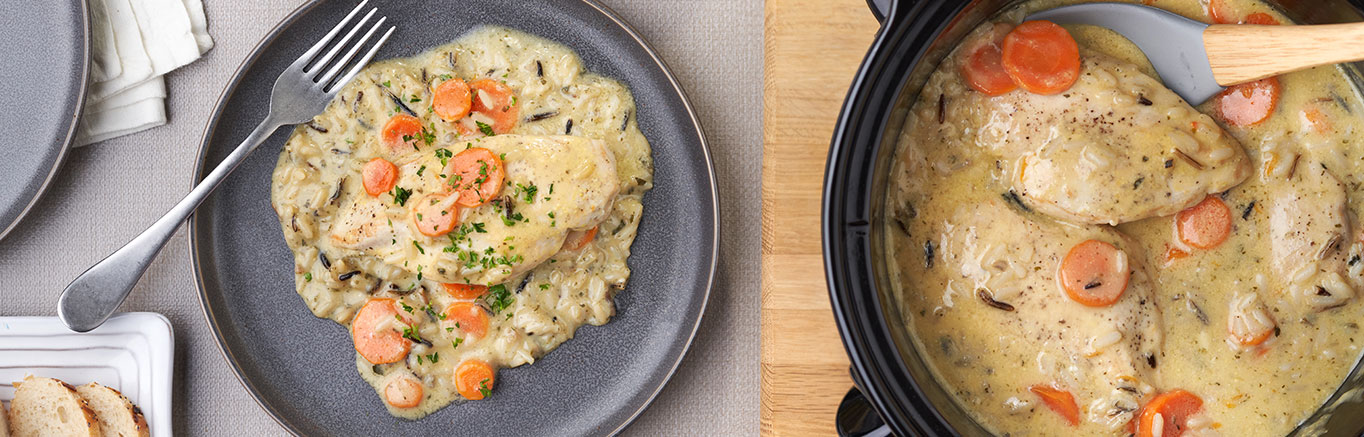 Stir the soup, water, carrots and rice with seasoning packet in a 5-to 6-quart slow cooker (make sure the carrots are submerged in the soup mixture). Season the chicken with salt and pepper. Add the chicken and turn to coat.