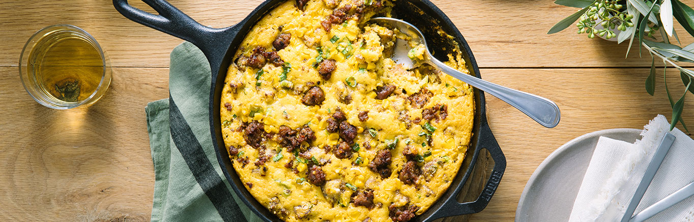 Heat the oven to 350°F. While the oven is heating, cook the sausage and white part of the onions in a 10-inch cast iron skillet (or other oven-proof skillet) over medium-high heat until the sausage is well browned, stirring often to separate meat. Add the corn and the white bottoms of the green onions and cook for 5 minutes. Remove the skillet from the heat.