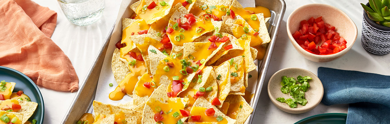 Want to know what we love most about these Super Quick Nachos? That the spicy cheese sauce stays creamy across the layers of tortilla chips, making each delicious bite so satisfying. Plus, the cheese sauce is made with our secret weapon—Campbell’s® Condensed Spicy Nacho Cheese Soup. Just blend the soup with milk, and you have the cheesy-meets-spicy accessory to the most party-pleasing appetizer. Make it a real party by layering on toppings like cilantro and tomato, and if you are a true spicy fan, throw on some pickled jalapenos. Check the tips for how to make these Super Quick Nachos supreme-style with ground beef.