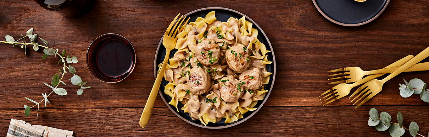 You don't have to make a trip to your favorite Scandinavian-based furniture store to get creamy, savory Swedish Meatballs. Homemade is always better, especially when it's this easy to make. Ground turkey meatballs are browned in a skillet for a crisp crust, then simmered in a mixture of cream of mushroom soup and beef broth, which melts into the most delicious sauce. In just 30 minutes you can have a comfort food that easily customizible with other types of ground meats (try beef or meatloaf mix, too). Swedish Meatballs are usually served over noodles, but feel free to use what you have on hand to soak up that yummy sauce, like rice or crusty bread!