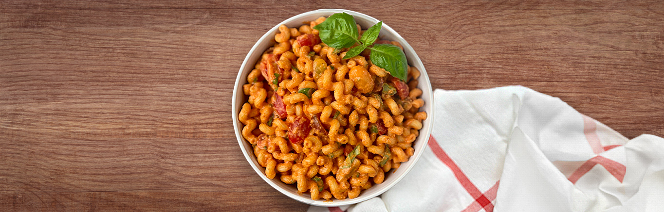 This is no ordinary pasta salad. The "dressing" is inspired by Spanish romesco sauce, a rich and flavorful mixture of tomato, roasted red pepper and garlic blended with almonds to thicken and add texture. The full flavors in this pasta salad recipe are perfectly balanced thanks to the base of Campbell's® Condensed Tomato Soup, with lemon and basil adding pops of freshness. Blend the dressing while the pasta is cooking, toss with fresh cherry tomatoes, basil and grated lemon zest. This pasta salad is ready in just 30 minutes- perfect for a weeknight dinner or a weekend cookout!