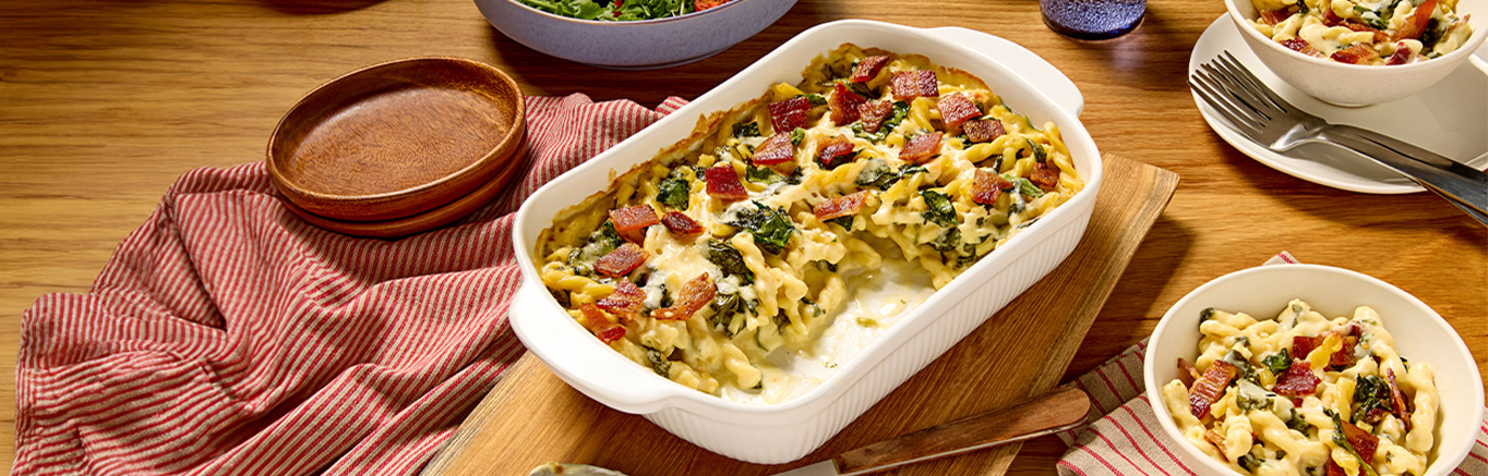 This creamy White Cheddar Spinach Bacon Mac and Cheese is a comforting, elevated mac & cheese perfect for any occasion. This recipe features tender gemelli pasta coated in a luscious sauce made with Campbell's® Condensed White Cheddar Cheese Soup, which provides a sharp cheddar flavor and an incredibly smooth texture. The delightful pairing of rich white cheddar and savory bacon creates an irresistible taste sensation, while fresh spinach adds a touch of color and subtle earthiness. Baked until bubbly and topped with crispy bacon, this mac & cheese is a guaranteed family favorite.