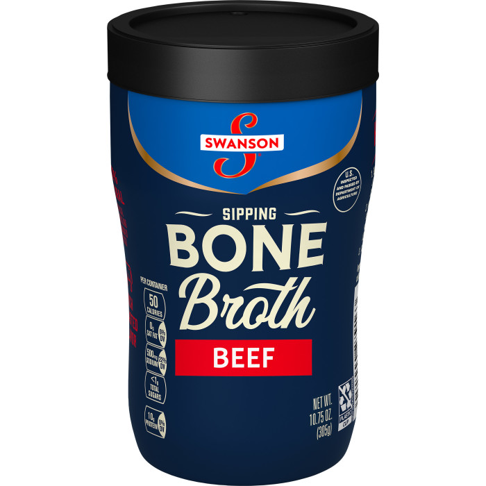 Swanson® Sipping Beef Bone Broth Cup is the nutritious snack that’s warm and savory, with naturally occurring collagen protein*. Packaged in a microwavable, sippable cup, our rich bone broth is a simple, flavorful way to add collagen protein to your on-the-go lifestyle. Just heat it up in the microwave fast for a super nutritious and low calorie on the go snack. Swanson® Bone Broth with naturally occurring collagen protein is made from simple, high-quality ingredients you can recognize.