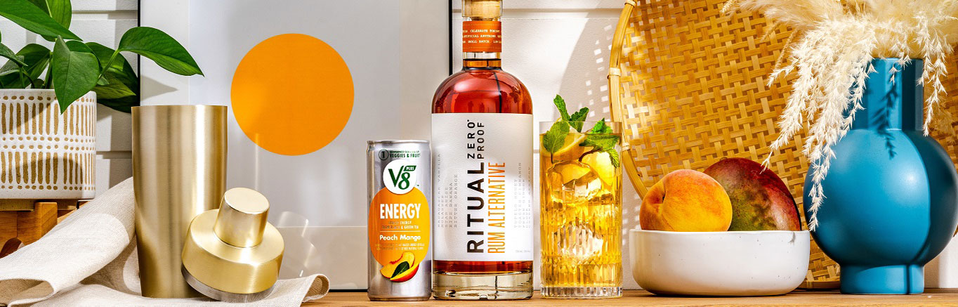 The classic pairing of rum and mint in a mojito can't be beat- or can it? It can when you add the sweet and spicy flavors of peach and mango in V8 +Energy Peach Mango! Using a rum alternative with the rich flavor of dark rum completes this perfect recipe, making a drink that's sweet, spicy, herbal and fresh all at once. It has all the complexity of a crafted cocktail, but all you need are four ingredients!