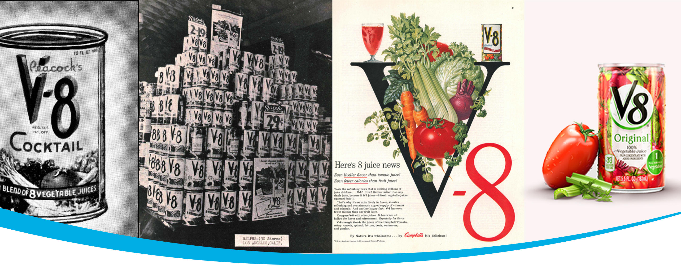 Through trial and error and a basement full of veggies they juiced and blended, all by hand, many different varieties until they found the perfect mixture of tomato and seven other vegetables. Just like that V8 was born: delicious juice blends and accessible nutrition, that’s what V8 stands for!